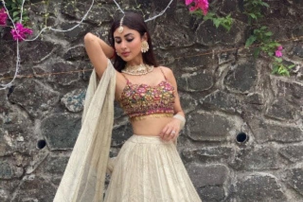 Mouni has paired a multicoloured choli with an ivory embellished lehenga for the photo-op.