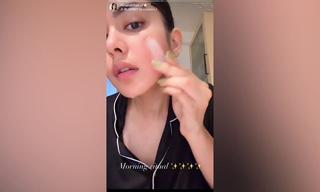 Mrunal took to her Instagram stories, where she shared a video of herself dressed in her night suit and rubbing ice water on her face. The video had Hanuman Chalisa playing in the background.