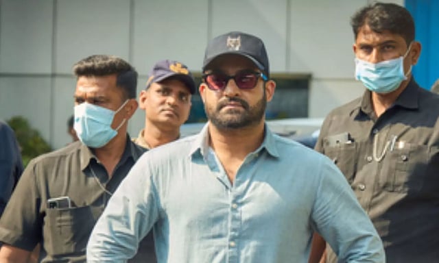 Images on social media show NTR wearing a pastel-blue shirt and blue denims. He topped the look with a black baseball cap, sunglasses, and black sports shoes.