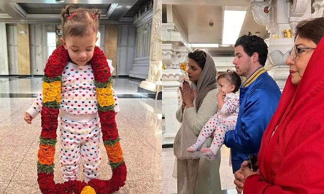 The next picture features the 'Bajirao Mastani' actor carrying Malti in her arms as the panditji did some puja in front of the deity of a Goddess for her. The actor's hubby Nick Jonas and mother Madhu Chopra also joined them for the temple visit and prayed to God for their daughter's well-being.