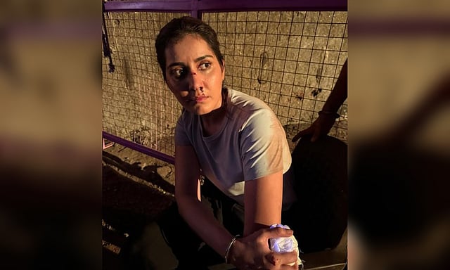 Raashii took to Instagram, where she shared a slew of images. In the photographs, the actress appeared bruised, bloodied, and intensely focused. She could be seen in a simple T-shirt and black pants, with the visible injuries on her nose and hand.