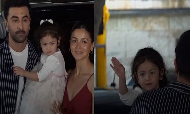 Before heading inside, the couple--Ranbir Kapoor and Alia Bhatt posed for the paparazzi with little Raha who was later seen sending flying kisses to the photographers. In the visuals, Ranbir was seen holding his daughter Raha while Alia was seen standing beside them in an adorable red dress.