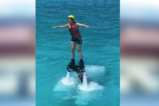 "Fall 7 times , stand up 8.. just that here I fell 70 times #flyboard #waterfreak," Rakulpreet wrote of her flyboarding experience.