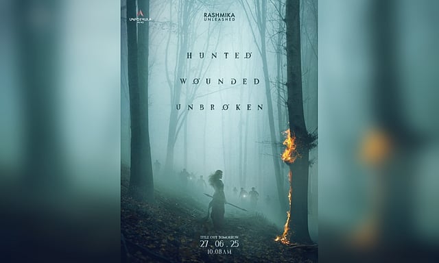 The poster that Rashmika shared had her holding a double-edged spear and standing next to a burning tree. It had the phrase "Hunted, wounded, unbroken" written on it.