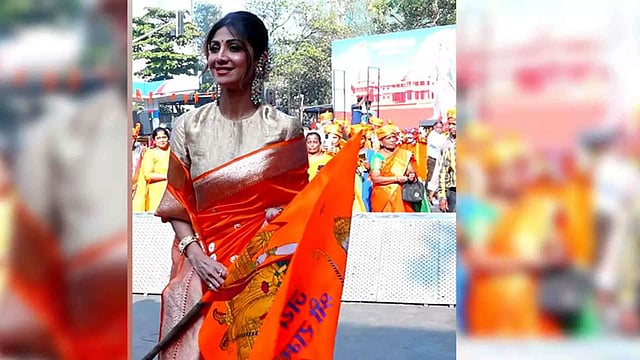 In the visuals captured by the shutterbugs in Mumbai, Shilpa can be seen chanting Jai Shree Ram. She also waved a saffron flag with Lord Ram's image on it.