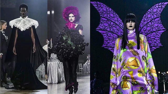 Models wore heavy, winged black eyeliner and black lipstick, matching their black gowns with long and pointy sleeves that draped to the floor for a dark fairy look.