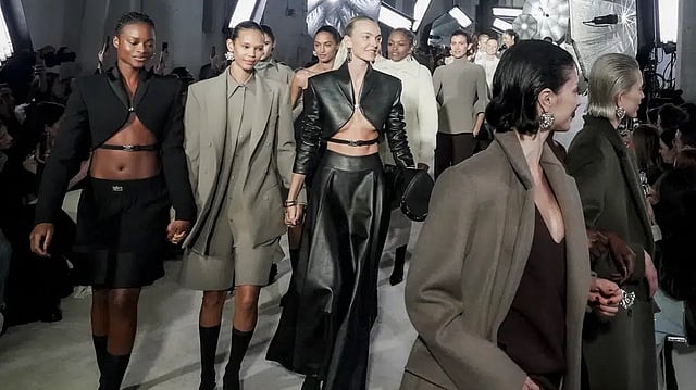 One of the best looks from the show was a two-piece cropped suit ensemble with a skinny belt around the waist. Other looks varied from long, slouchy textured knitwear in brown and white, cozy enough to sleep in, and a three-piece leathery burgundy look that hung off the model.