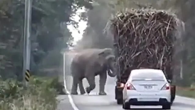 In the clip, an elephant is seen stopping a truck in the middle of a road, snatching sugarcanes from it, and feasting on them.