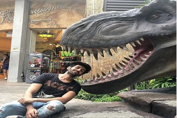In an Instagram picture Kartik posted, he is at an amusement park next to a dinosaur figure, pretending to slide his head into the animal's wide-open jaws.