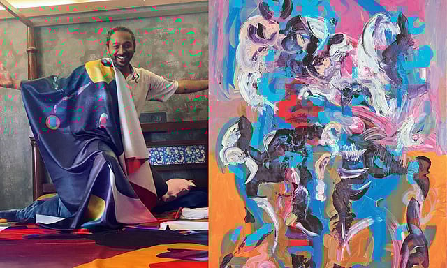 Each artwork in this new series is, to Raghava, a philosophical question. “I have always seen myself as a storyteller, but I realised that holding on to a story too tightly can be destructive. Stories can both divide and unite people. This abstract series is my experiment with storytelling without a fixed narrative, allowing the figure to dissolve and transcend itself.”