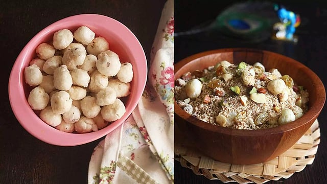 In a pan, roast the makhana on low flame, stirring occasionally. To test if they're done, pop one or two in your mouth; they should be crispy. If not, roast them a bit longer. Set aside.