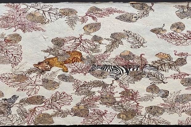 "Every work conjures a space of fantasy and inevitable folly. Much of the smaller reptilian and cacti-like flora and fauna drift into this series from the earlier body of work in 'Of herbariums, hortoriums and home', exhibited in 2018. Observed mostly from a visit to the Udawallawe National Park in Sri Lanka on a visit in October 2018, visits to the Yala and Wilpattu Sanctuaries in Sri Lanka, as also another visit to Tanzania remain derailed due to the ongoing pandemic," notes Paula Sengupta.