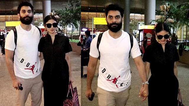 Mouni was snapped walking hand-in-hand at the airport with her husband Suraj Nambiar