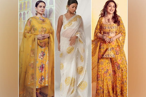 When confused between traditional or western, an indo-western outfit can be your answer. Go for a flowy yellow fabric with prints of the spring season - like the gorgeous flowers on Madhuri Dixit's jacket-palazzo set or Neha Dhupia's dressy-kaftan with trees printed on it. On the accessories front, you can freely explore - either go elegant like Neha with a sleek neckpiece or rock the jewellery with earrings, necklaces, bangles and rings like Madhuri. As seen on our divas, a natural-look hairdo will complete your stylish look effortlessly.