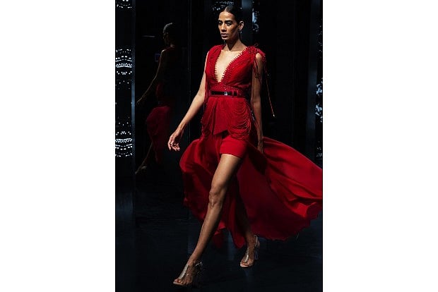 Menswear featured intricate metallic embroidery on sharp tailored jackets and Tuxedos made from rich velvet and textured silk fabrics. The womenswear retained the label's signature structured yet feminine and sensual silhouette. Trending silk organza incorporated meshe, feathers, sequins and fringes on the garments.