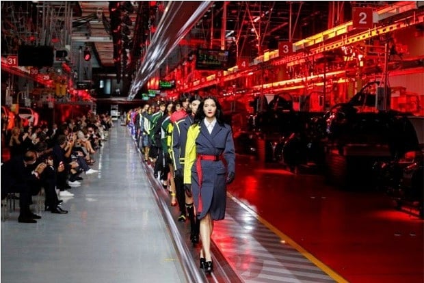 The fashions, by creative director and former Armani designer Rocco Iannone, were on show at the Ferrari plant in Maranello, with a catwalk set up on the assembly line for the "Prancing Horse" V12 sports cars, such as the new 812 Competizione.