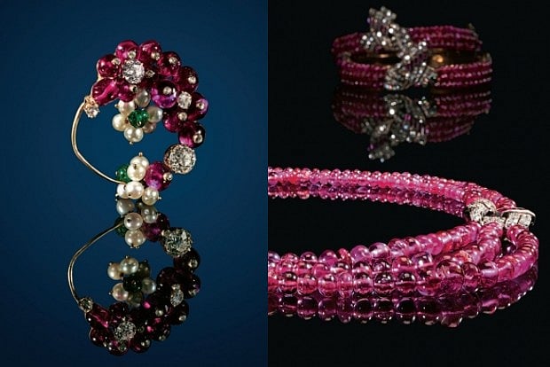Lot no. 7 is a vintage gold 'nath' set with Burmese ruby beads, rose-cut diamonds, natural pearls, and emeralds. 'Naths' or Nose rings are popular all across India and are generally worn during special occasions and auspicious ceremonies. This traditional Indian piece of heirloom jewellery will be offered with an estimate of Rs 12,50,000 -- 15,00,000.