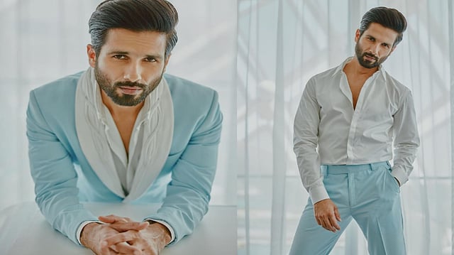 Shahid struck a stylish pose in the second picture, holding his jacket with both hands. He chose to wear the same sky-blue coloured trousers and matched his attire with back-brushed hair.