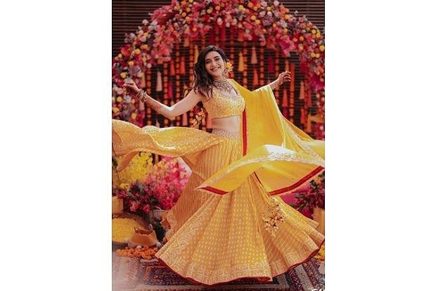 Karishma looked stunning in a yellow bandhni lehenga with a pink tinge, while her would-be husband looked dapper in a block printed redchuridar kurta.