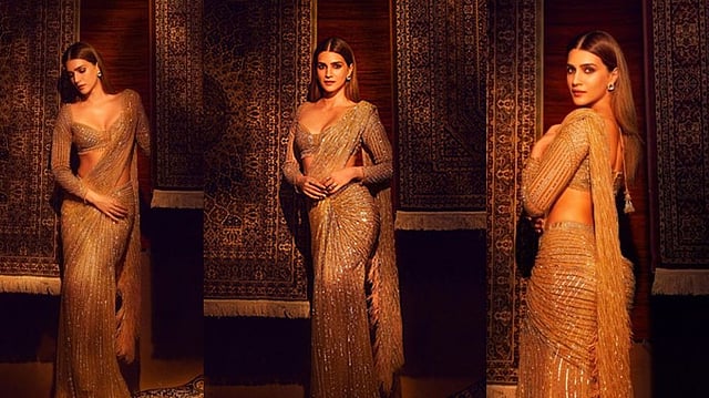 NEW DELHI: Bollywood actor Kriti Sanon never fails to catch the eyeballs with her amazing looks and this time 'Mimi' actor, on Monday, shared a string of posts in a contemporary embellished golden saree, looking flawless in the royal-themed pictures.