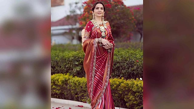 Nita Ambani was seen draped in a handloom Kanchipuram saree at a dinner hosted for Reliance employees in Jamnagar. She thanked the Jamnagar Reliance Parivar for their love and support during the celebrations.