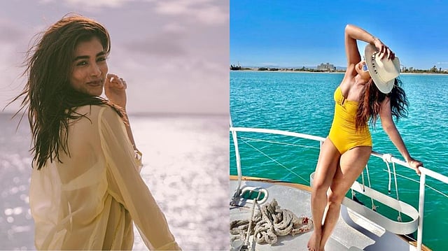 Pooja Hedge imparted beach vibes in a white bikini that she teamed up with a light-yellow shrug.