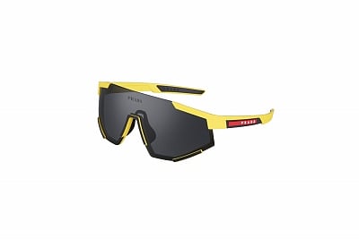 SPS04W: Sunglasses from the new Prada Linea Rossa Impavid Active collection. The large shield front is characterized by geometric profiles enhanced by innovative nylon inserts that disrupt their linearity. The temples feature a contemporary multilayer construction that highlights their dynamic attitude. Presented in an array of rubber hues of Black, Yellow and White with hydrophobic lenses in tones of Slate and in an exclusive Citron version. Prada Linea Rossa band logo.