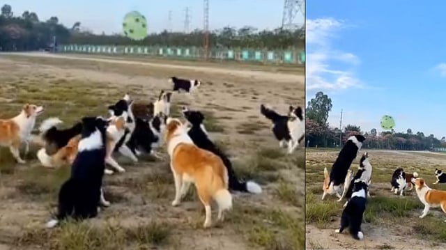 The video shows a bunch of border collies playing fetch with a balloon and having their own fun, they hit the ball up in the air with their snout and thus creating the sensation on the internet.