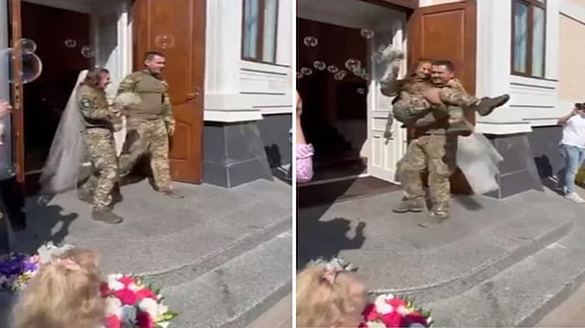 The clip shared by Anton Gerashchenko on Twitter is of a couple walking out of a church dressed in military clothes. Along with the military costume, the bride also wears a white veil on her head and holds a flower bouquet. The clip ends with the groom carrying the bride in his arms, while the spectators cheered them on.
