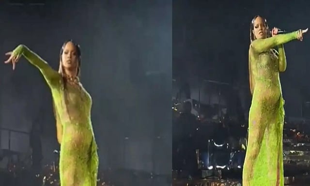 In the viral videos, Rihanna can be seen wearing a sheer fluorescent green bodycon and glittery gown. She interacted with the guests at the event while performing on the stage.