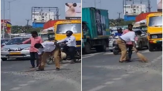 In the viral clip, shared by IAS officer Awanish Sharan on his Twitter handle, the traffic policeman was seen sweeping small pebbles and rocks, which could lead to tyre punctures, off the road with a broom while the traffic signal was red.