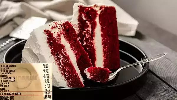 The bill depicted additional fee of stating "20 x Servizio Torto" meaning 20 euros per slice of cake cutting i.e Rs.90 per slice.