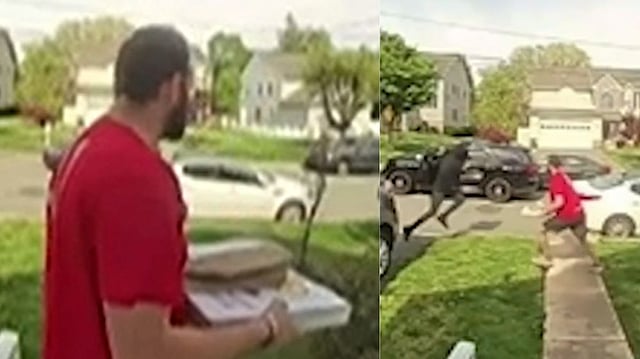 The CCTV footage was posted on Facebook by the pizza company Cocco's Pizza with the caption, "Sorry for the inappropriate language, but we thought it was warranted. Special shoutout to our delivery driver Tyler, who assisted the Brookhaven police today, and still delivered the food unharmed!!" (sic)