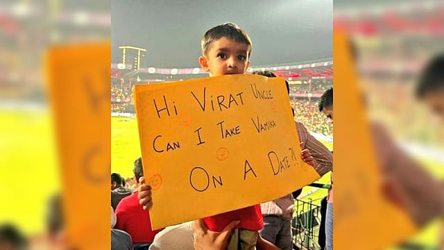 CHENNAI: A young boy at the RCB vs CSK match held a placard with a special request to Virat Kolhi. The card read, "Hi Virat uncle. Can I take Vamika on a date?"