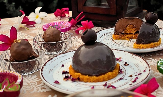 Fold the ganache into the whipped cream. Pour the mixture into a silicon mold infused with boondi, ensuring the mold is filled completely to create the mousse base.