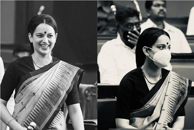 Kangana took to Twitter, where she shared a new look from the film. In the monochrome picture, the actress is seen sporting a sari and her hair is tied back into a bun.