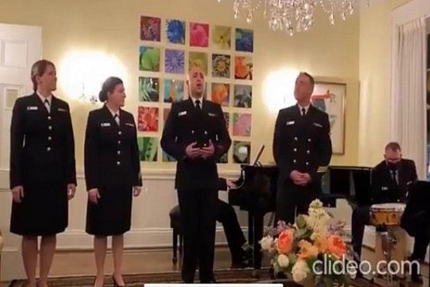 The clip shows a team of singers and musical instrument players from the US Navy band dressed in their uniforms as they present the song.