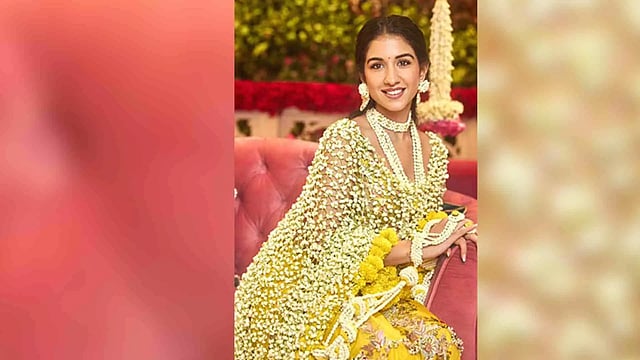 MUMBAI: Pictures of bride-to-be Radhika Merchant from her Haldi function are out and undoubtedly her look is as mesmerising as ever. The highlight of her yellow ensemble created by Anamika Khanna was her "phoolon ki chadar dupatta." The dupatta was adorned with mogra flower buds while the border featured yellow marigold flowers.