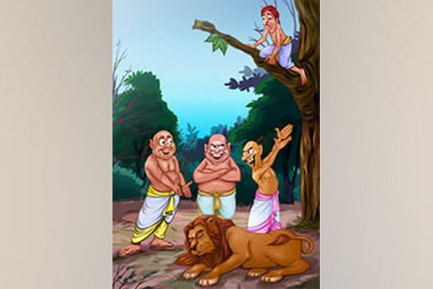 Shivanand, the one considered to be uneducated, lazy and a fool tries to stop them and warns them of the consequences of their plans but they do not stop. While the three ‘learned’ friends foolishly proceed with their plans, Shivanand climbs a tree to save himself. The lion then comes to life and devours the three learned fools.