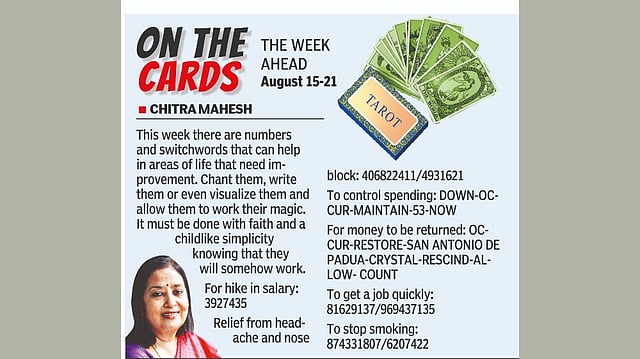 CHENNAI: This week there are numbers and switchwords that can help in areas of life that need im- provement. Chant them, write them or even visualize them and allow them to work their magic. It must be done with faith and a childlike simplicity knowing that they will somehow work. For hike in salary: 3927435 Relief from head- ache and nose block: 406822411/4931621 To control spending: DOWN-OC- CUR-MAINTAIN-53-NOW For money to be returned: OCCURESTORESAN ANTONIO DEPADUA-CRYSTAL-RESCIND-AL- LOW- COUNT