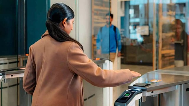 The palm-recognition technology uses advanced artificial intelligence and machine learning to create a palm signature that is associated with identification credentials like a badge, employee ID, or PIN.