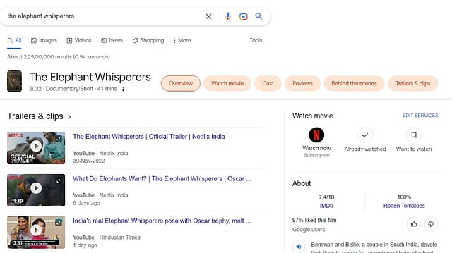 NEW DELHI: Online searches for "The Elephant Whisperers" on Google skyrocketed by a whopping 8,164 per cent worldwide after winning the award for the Best Documentary Short Film at the 95th Academy Awards, a report showed on Friday.
