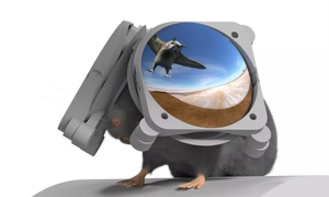 Called Miniature Rodent Stereo Illumination VR (iMRSIV), the system comprises two lenses and two screens — one for each side of the head to separately illuminate each eye for 3D vision.