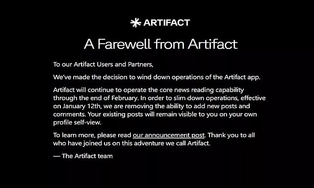 The existing posts, however, will remain visible to users on their profile self-view. In the meantime, Artifact will continue to operate the core news reading capability through the end of February.