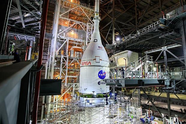 Engineers and technicians successfully secured the Orion spacecraft atop the fully assembled Space Launch System (SLS) rocket at the agency's Kennedy Space Center in Florida just before midnight October 21, the US space agency said in a statement.