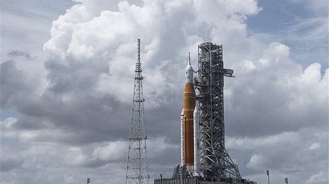 The 322-foot (98-meter) rocket — the most powerful ever built by NASA — remains on its pad at Kennedy Space Center with an empty crew capsule on top.