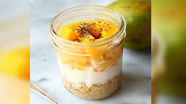 * Soak oats in 1 cup of milk, refrigerate it overnight for 5-6 hours * Now make the smoothie, add soaked oats in the blender. Add Mango pulp, and milk, blend it to a smooth consistency * Pour mango smoothie into a serving glass, top it with mango cubes and chia seeds and honey Summer