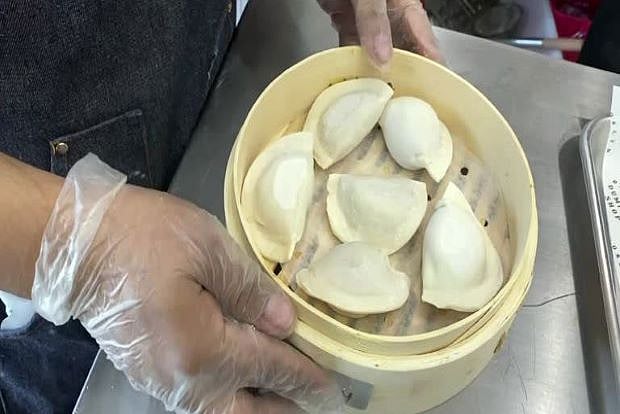 In New York, two chefs make fresh dumplings around the clock behind a glass wall in the shop. Cooks then boil and fry the dough to order.