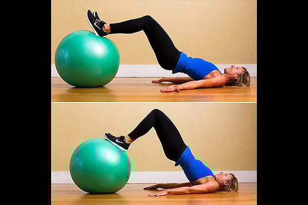 Lie on your back on the floor with legs straight, heels resting on the ball. Lift hips toward the ceiling and engage your core to maintain balance. Bend your knees, squeezing your hamstrings and glutes to curl the ball in toward your glutes. Return to start with legs extended, hips up, for one rep. Do 10 to 15 reps.