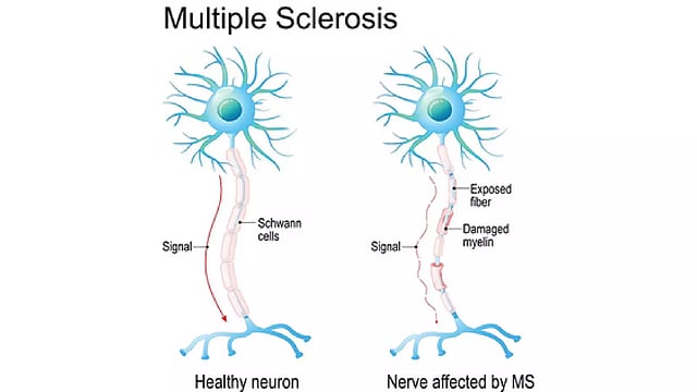 In MS, the body’s own immune system attacks and damages myelin, the protective sheath around nerve fibres, causing disruption to messages sent around the brain and spinal cord.